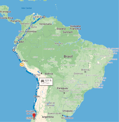 Así, de acuerdo con el cálculo realizado, tomando como base la distancia entre Caracas y Lima multiplicado por el costo por kilómetro, se observa que el gasto para llegar a la capital del Perú fue de 5,868.8 dólares. En el gráfico 12 se observa la ruta probable.