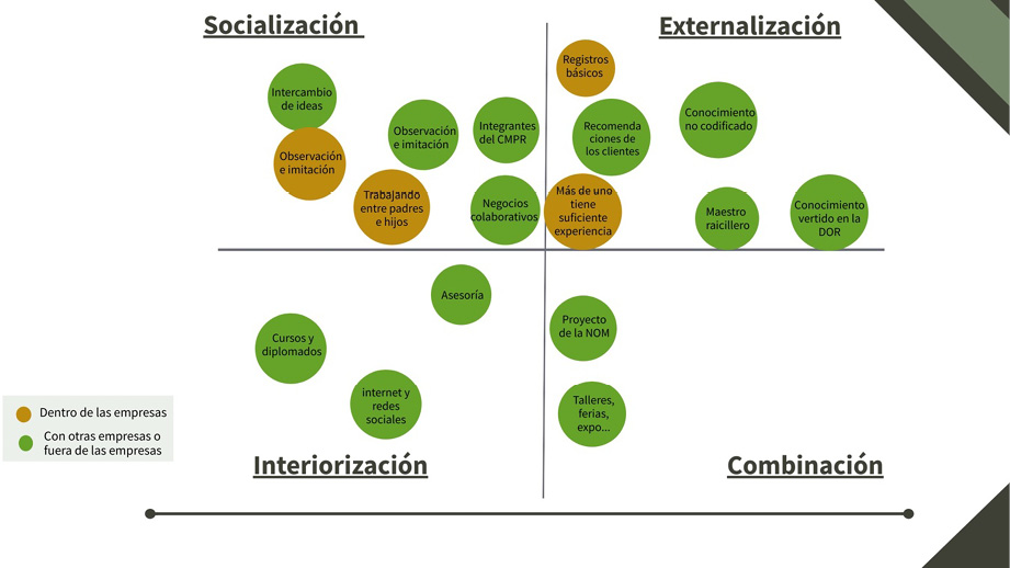Sin embargo, este intercambio de conocimiento es, sobre todo, de manera individual (fase de socialización), y si bien comienzan a presentarse las otras fases del proceso de conversión del conocimiento en explícito, ello es incipiente en tanto no existen o son insignificantes, por ejemplo, los manuales internos que den cuenta de las actividades que ocurren dentro de las propias empresas; la grabación de determinadas fases o de todo el proceso productivo; folletos o ilustraciones de las actividades distintivas; espacios o repositorios de los distintos medios que contienen los conocimientos codificados en la materia; investigaciones y publicaciones que den cuenta del sector, etcétera.