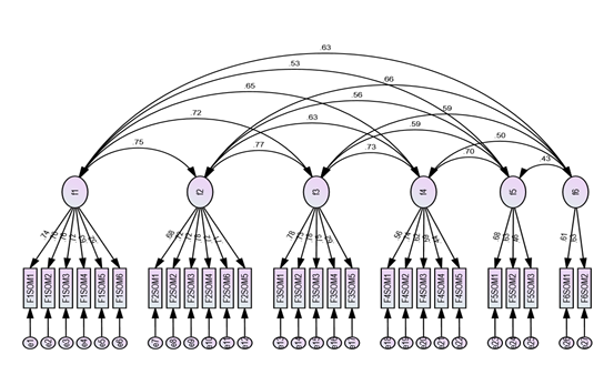Razón chi cuadrado igual a 2.95 (valor teórico exigido mayor que 3). Todos los ítems se saturaron en seis factores que alcanzaron 60,38% de la varianza total explicada (ver Tabla 1). Para determinar la adecuación de los datos se corrió la prueba de Kaiser-Meyer de esfericidad KMO=.926 que especifica que mientras mayor sea el índice, habrá más comunalidad disponible en la matriz de correlación (Ferrando et al., 2022) y Bartlett (χ² = 3824.23; df = 351; p ≤ .001), ambos son indicadores de la adecuación de los datos para realizar el análisis factorial (Díaz, 2018). Una vez que determinamos que los datos eran favorables, se corrió el Análisis Factorial Confirmatorio (ver Figura 1). Los factores 5 y 6 no alcanzaron los índices de confiabilidad esperados, por lo que se sugiere eliminarlos de la nueva versión de la escala.