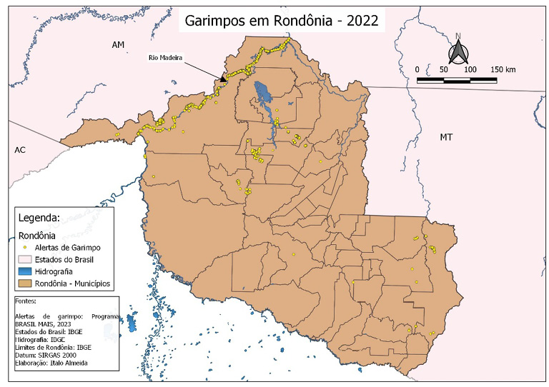 Figura 2. Mapa de alertas de garimpo em 2022 em Rondônia.