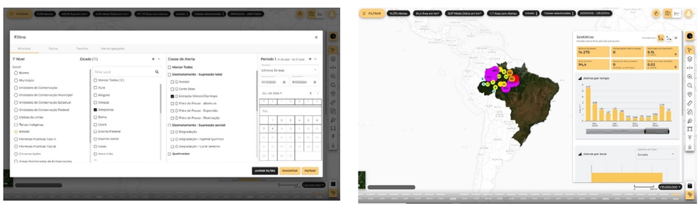 A plataforma BRASIL M.A.I.S. (BRASIL, 2024) disponibilizou imagens da constelação PlanetScope, com mais de 130 satélites de observação (PLANET LABS, 2023). Entre suas ferramentas, destaca-se o Dashboard, sistema de alertas baseado em algoritmos de detecção automática de alterações multitemporais, que compararam imagens em diferentes datas e geraram “alertas” vetoriais. As transformações detectadas incluíram desmatamento associado à mineração, corte raso, queimadas, abertura de pistas e embarcações (BRASIL, 2024). A classificação utilizou parâmetros espectrais, texturais e geométricos, assegurando precisão espacial. A automatização dos alertas, filtráveis por tipo, localidade ou período, conferiu agilidade e objetividade às análises, conforme ilustrado na Figura 2.