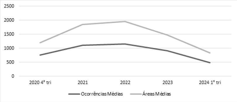 A Figura 2 mostra a geração de “alertas” de alterações, representados por polígonos vetoriais integrados a Sistemas de Informação Geográfica (SIG) como camadas temáticas. Essa integração possibilitou análises espaciais avançadas — interseção com Unidades de Conservação, Terras Indígenas e limites municipais —, além de cálculos de área, proximidade e estatísticas, evidenciando a utilidade dos SIG no diagnóstico e gestão territorial da ASGM (Longley et al., 2011). Foram utilizados alertas do Dashboard referentes à mineração de ouro no Amazonas, entre o 4º trimestre de 2020 e o 1º de 2024 (14 trimestres). A divisão trimestral assegurou consistência à série temporal, resultando em arquivos georreferenciados com atributos de data, área, perímetro e localização, que subsidiaram mapas, gráficos e tabelas sobre a evolução da ASGM.