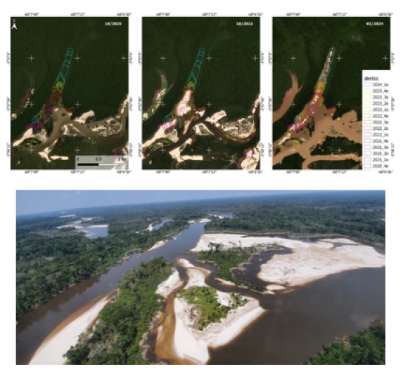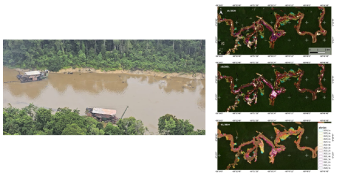 Imagens multitemporais (2020–2024) evidenciam a progressão da ASGM na bacia, complementadas por fotografia aérea. Acervo do autor: (20/09/2021).