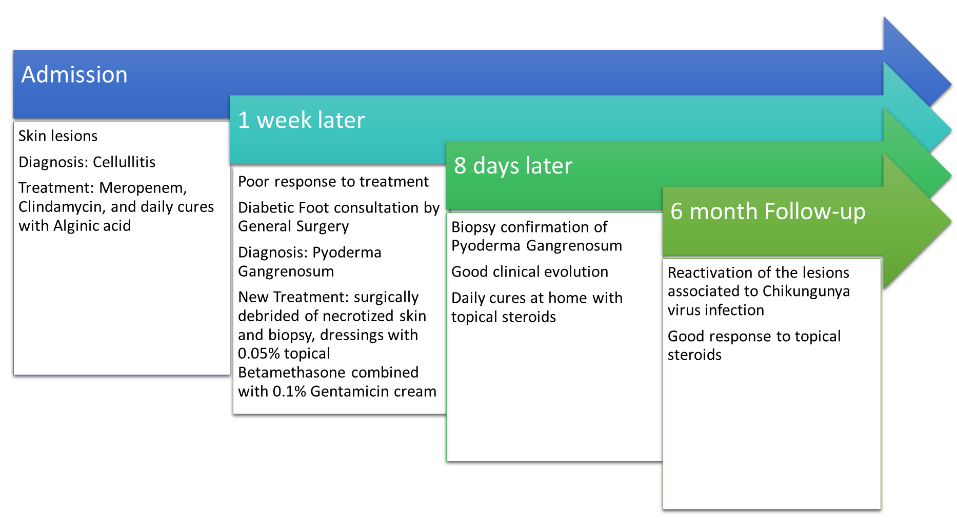 Recently, some studies have reported good results using only topical steroids (5,6), however the severity of disease and selection of cases for only topical treatment, plays an important role in success rates. The objective of this study is to demonstrate the clinical progression of a diabetic patient with PG, treated with topical steroids as a way to avoid systemic steroids which would be more counterproductive in diabetic patients.