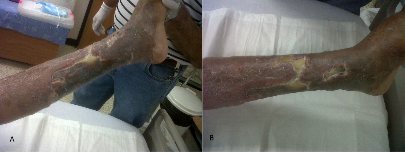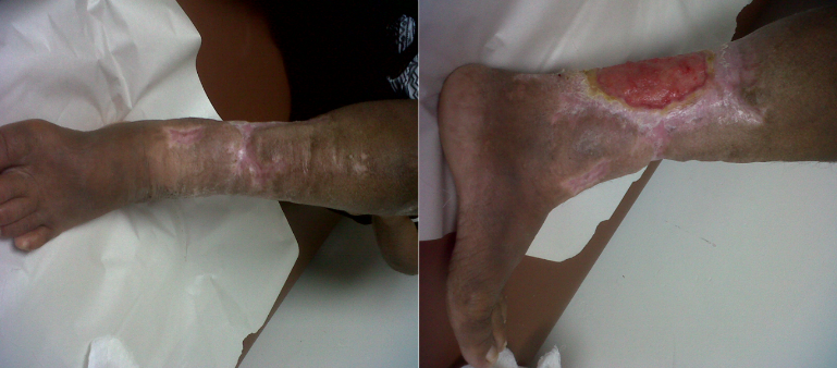 Clinical findings: the physical examination revealed left leg ulcers with hyperemic borders in the left calf and pretibial area These lesions extended to two-thirds of the leg and converged into a single ulcer, there was no purulent discharge or bleeding (Figure 1 and 2). The laboratory testing showed a fasting glucose level of 320 mg/dl, creatinine 1.2 mg/dl, hemoglobin 11.5 g/dL, white blood cell: 9,200xmm3 with 70% neutrophils and 26% lymphocytes, and platelets 165,000 x mm3.