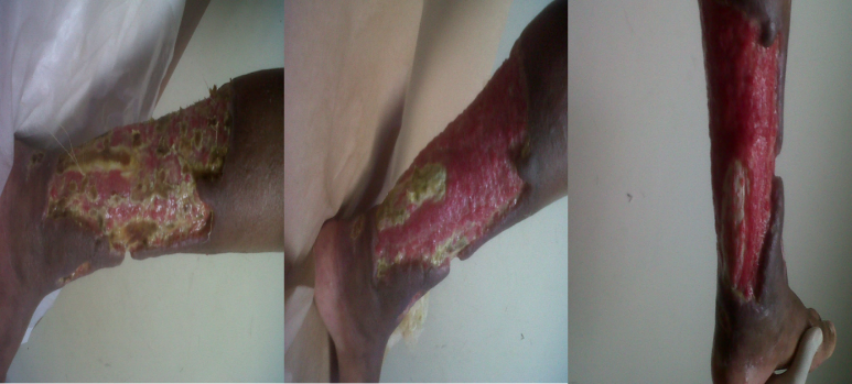 Figure 1. Extensive confluent ulcers involving two-thirds of the left leg