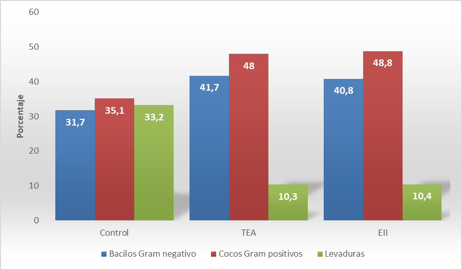 casos de disbiosis respecto al grupo control (p<0,001). La microbiota transitoria causante de disbiosis estuvo