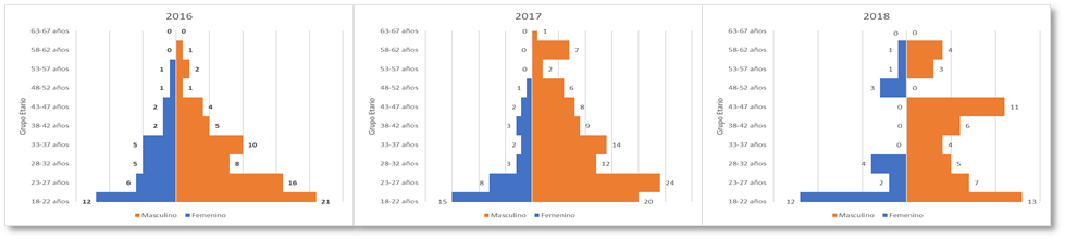 2016 (n = 34; 33.33%). The age group most compromised was the range of 18-22