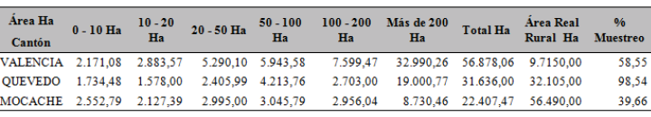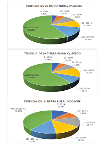 De acuerdo con Muñoz, Gentili y Bustos (2020): El rápido crecimiento demográfico y la creciente demanda internacional de productos tropicales han propiciado la conversión de extensas áreas de tierra para la producción agrícola intensiva de varios monocultivos en el Ecuador” (p.92). En ese sentido, la estructura de la tenencia de la tierra rural en los cantones Valencia, Quevedo y Mocache de acuerdo a la superficie total por hectárea se presenta en la Tabla 3.