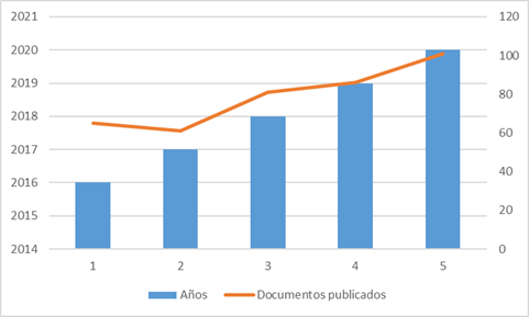 durante el período 2016-2020 se obtuvo un total de 389 documentos, donde se analizaron