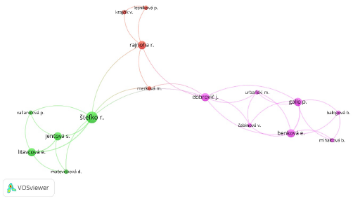 El gráfico 2 muestra la red de colaboración científica basada en la coautoría de artículos sobre gestión financiera para la toma decisiones en las instituciones de educación superior. Los autores se asociaron, según la herramienta VOSviewer, en 3 grupos. El grupo 1, de color rosa, lo encabeza Benková E. y se asocia con Dobrovič J., Gallo P., Balogová B., Mihalčová B., Urbański M. y Čabinová V. El grupo 2, de color verde, está liderado por Štefko R. y se asocia con Jenčová S., Litavcová E., Maťovčíková D. y Vašaničová P. Finalmente, el grupo 3, de color rojo, está liderado por Rajnoha R. y se vincula con Krajčík V., Lesníková P. y Merková M.