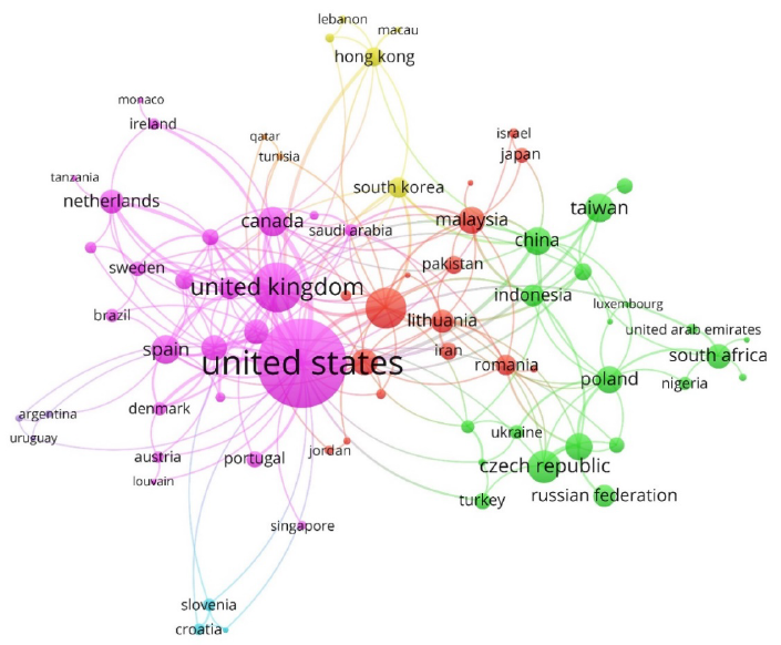 El gráfico 4 representa el mapa de colaboración entre los principales países basado en la coautoría de sus autores. El software VOSviewer ha detectado la asociación según 6 grupos. El grupo 1 (color rosa), el más numeroso, está encabezado por Estados Unidos y se asocia con Reino Unido, Canadá, España, Alemania, Italia, Países Bajos, Francia, Suiza, Bélgica, Portugal, Suecia, Brasil y Dinamarca. El grupo 2 (verde) está liderado por Republica Checa y se asocia con Taiwán, China, Polonia, Eslovaquia, Sudáfrica, Indonesia, Rusia, Nueva Zelanda, Turquía, Hungría y Filipinas.