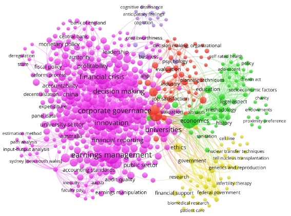 Se han identificado 5 grupos principales, representando los distintos puntos de vista sobre la investigación de este campo de estudio. Las principales palabras clave asociadas a cada grupo son: earnings management (gestión de ingresos), financial management (gestión financiera), entrepreneurship (emprendimiento), ethics (ética), y organizational culture (cultura organizacional), en torno a las cuales se vinculan el resto de los términos de las publicaciones sobre este tema de investigación.