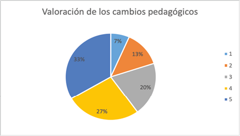 A continuación, se describe el análisis estadístico de las preguntas cuantitativas que se consideraron más relevantes, así como el análisis de sentimientos de las dos preguntas cualitativas. De este modo, en el Gráfico 1 se presentan los resultados consolidados de la pregunta referente a la valoración que dan los profesores a los cambios pedagógicos que implicó la enseñanza mediada por las TIC durante la presencialidad remota.