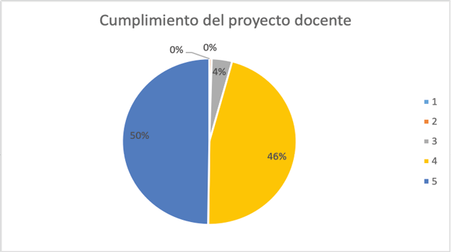 Del mismo modo, en el Gráfico 2 se presentan los resultados referentes a la valoración otorgada por los docentes con respecto al cumplimiento del proyecto docente en cada uno de sus cursos. 96% de las valoraciones indica un cumplimiento mayor o igual a 80%. Lo anterior, permite concluir que las estrategias propuestas por la Universidad tuvieron un efecto positivo en el desarrollo de las actividades académicas.