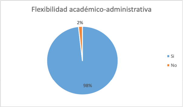 Por otra parte, en el Gráfico 3 se evidencian los resultados con respecto a la flexibilidad académica y administrativa de la Universidad durante el primer semestre de 2020. 98% de los profesores, considera que hubo flexibilidad administrativa por parte de la Universidad, lo cual concuerda con el hecho de que diferentes procesos y trámites docentes fueron dispuestos para realizarse de manera virtual.