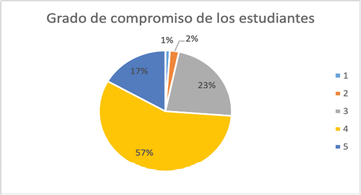 Así mismo, en el Gráfico 4 se muestran los resultados con respecto a la valoración otorgada por los profesores con respecto al grado de compromiso de los estudiantes durante el desarrollo de las actividades académicas en el periodo de presencialidad remota. De acuerdo a estos resultados, 74% de los profesores asignaron un grado de compromiso de los estudiantes con una valoración mayor o igual a 4, lo que correspondería porcentualmente a un grado de compromiso mayor o igual al 80%. Lo anterior es un porcentaje aceptable teniendo en cuenta que los estudiantes debieron adaptarse intempestivamente a las dinámicas exigidas por el desarrollo de actividades académicas de manera virtual.