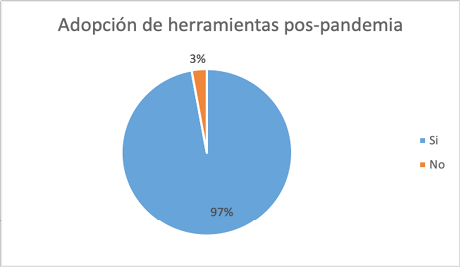 Finalmente, en el Gráfico 5 se muestran los resultados referentes a la opinión de los profesores con respecto al uso de las herramientas tecnológicas una vez superada la emergencia sanitaria, al respecto, 97% de los profesores consideran importante continuar usando algunas de las herramientas tecnológicas. En este sentido, es importante mencionar que además de las herramientas de videoconferencia, la Universidad planteó a través de su estrategia otras herramientas para promover el trabajo colaborativo, así como para la gestión del curso, las cuales son un complemento adecuado a las labores docentes de manera independiente a la presencialidad o presencialidad remota.