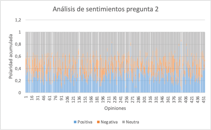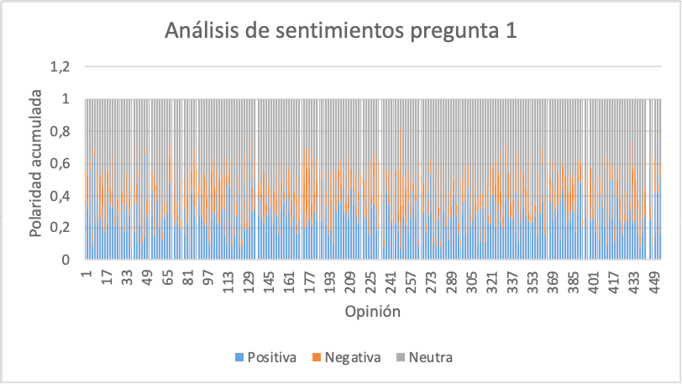 En la Figura 2 se muestra la distribución de polaridad acumulativa para cada una de las opiniones con respecto a la pregunta cualitativa 1, es decir, para cada opinión se muestra como se distribuyen los 3 niveles de polaridad.