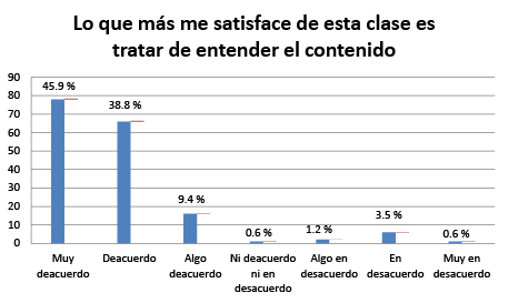 Respecto a la valoración que los estudiantes tienen del curso lo que más les satisface es tratar de entender el contenido de la manera más profunda, eso también demuestra su sentido de responsabilidad, su interés e identificación con el curso de Argumentación Jurídica (Gráfico 2).