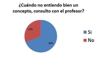 Respecto al componente de Estrategias de gestión y recursos en su sub-escala de Búsqueda de ayuda; el mayor porcentaje se encuentra en la alternativa “SI”, con un 69% y con “NO” en un 31% (Gráfico 5). Lo cual, representa que más de la mitad de los estudiantes cuando no entienden bien un concepto del curso, lo consultan con el profesor para despejar todo tipo de dudas que pueda generarse en el desarrollo de la asignatura.