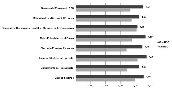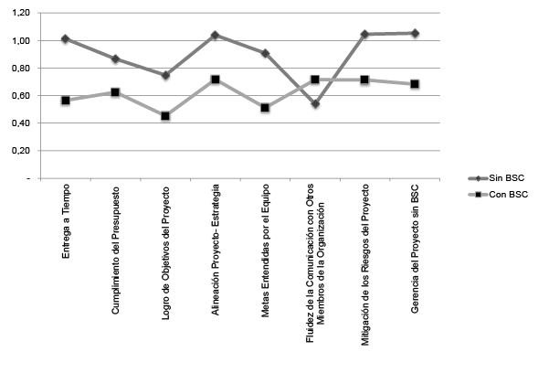 En este apartado se presentan los resultados de la indagación con gerentes de proyectos, para cada una de las variables de proyectos gestionados, sin utilizar el BSC, y también de proyectos que implementaron el BSC. Como se puede ver en el análisis estadístico descriptivo indica que son favorables los resultados obtenidos en proyectos en donde se utiliza el BSC como sistema para lograr la alineación del proyecto con la estrategia, el entendimiento de las metas del proyecto por parte del equipo, los resultados de la triple restricción (tiempo, presupuesto y objetivos), la comunicación con otros miembros de la organización, la gestión de los riesgos y en general la gerencia del proyecto. El gráfico 1 presenta los valores promedio comparativos