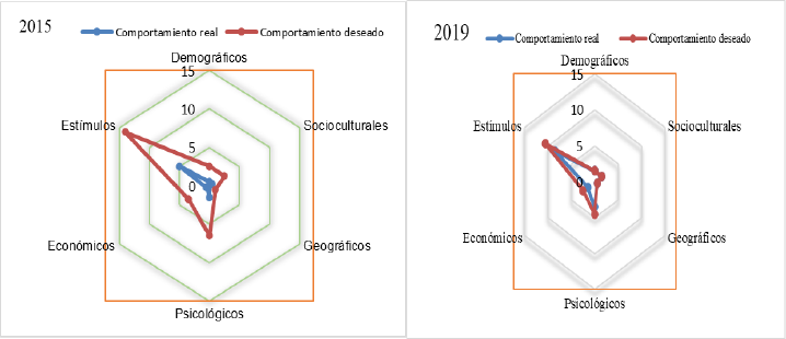 En el gráfico 2, se ilustran los resultados radial comparativo de los estados real y deseado del comportamiento del consumidor para los años 2015 y 2019 observando como ambos estados van acercándose y mostrando un comportamiento de acuerdo a lo deseado para el destino turístico.