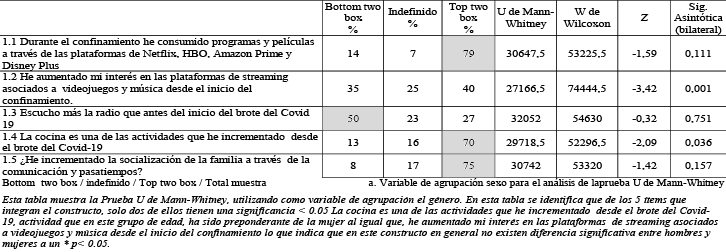 Constructo 1. Factores personales (consumo masivo de entretenimiento). Son actividades que las personas buscan como medio alterno o complementario a las actividades laborales o del hogar, para tratar de minimizar el impacto a la adaptación de una vida en confinamiento, encontrando que no existen diferencias por género, (tabla 1).