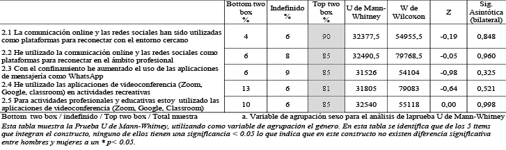 Constructo 2: Factores sociales (Comportamientos sociales en tiempo de distanciamiento, relaciones sociales). En este constructo se analizan las actividades tecnológicas de socialización que desarrolla este grupo de personas en la situación de aislamiento propiciada por el COVID-19, sin diferencias estadísticamente significativas por género, (tabla 2).