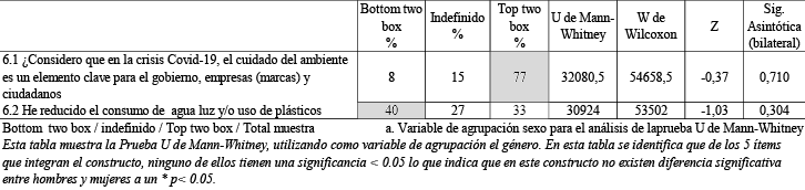 Constructo 6: Consumo sustentable. Este factor responde a las practicas del target frente al cuidado del medio ambiente y la optimización y ahorro de los recursos, (tabla 6).