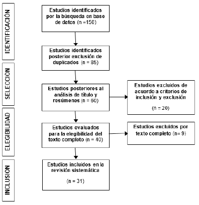 Partiendo de la cantidad inicial de artículos identificados (n = 150) obtenidos bajo la ecuación de búsqueda previamente establecida, y considerando la necesidad de poder establecer una revisión exhaustiva y rigurosa, siguiendo la metodología PRISMA fueron excluidos por criterio de duplicación 65 artículos; por los cuales se incluyeron en el proceso de selección 85, de los cuales se realizó el análisis de títulos y resúmenes correspondientes, obteniendo como resultado la eliminación de 25 estudios, considerándose un total de 60 artículos para el análisis de los criterios de inclusión y exclusión por los cuales se procedió a la eliminación de 20, quedando un total de 40 artículos para el proceso de elegibilidad.