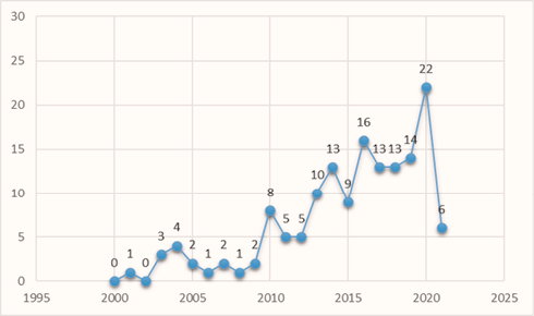 De esta manera, la búsqueda inicial a través de las bases de datos seleccionadas (Scopus, Scielo y Redalyc) arrojó un total de 150 resultados, que corresponden a estudios que se relacionan a la gestión de ordenamiento territorial sostenible. En el Gráfico 1 se muestran los resultados del período 2000 al 2021.