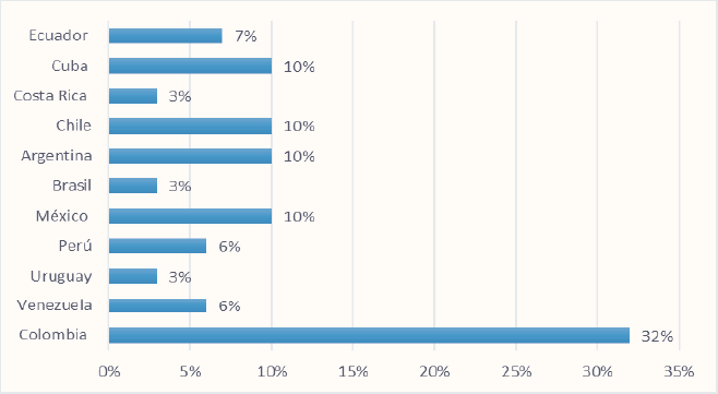 Respecto a los países en Latinoamérica que han desarrollado mayores proyectos de investigaciones relacionadas con la gestión de ordenamiento territorial sostenible se encuentran: Colombia (32%), Chile (10%), México, Cuba y Argentina con 10% cada uno. Por otra parte, países como Ecuador siguen esta tendencia ascendente de investigaciones sobre la temática con un 7%, así como Perú y Venezuela con un 6%. Finalmente, los países que presentan una menor incidencia de publicaciones son los países de Uruguay, Costa Rica y Brasil con un 3% del total de estudios encontrados; no obstante, la tendencia tal como se mostró en la distribución cronológica sigue ascendiendo en diversos países, representando esto un avance considerable en las contribuciones en el contexto Latinoamericano, Ver Gráfico 3.