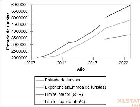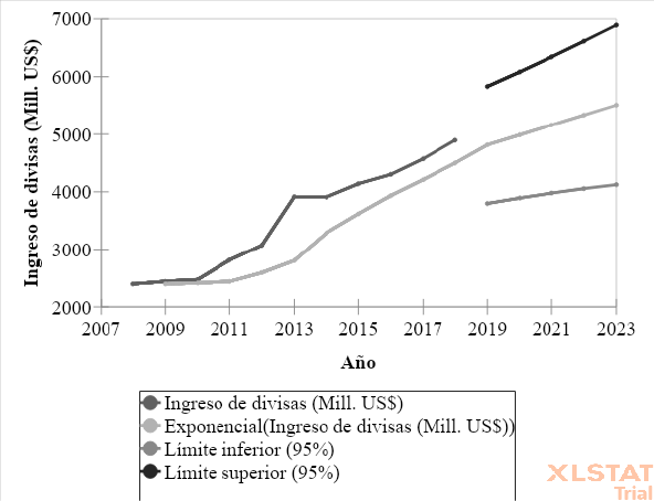 El ingreso de divisas del sector turismo para el año 2018 fue de 4894 millones de US$, se estima para finales de 2020, dentro del plan de recuperación pos Covid-19 en 4988 millones de US$. Explicando un incremento de 94 millones de US$ para el sector, esto se traduce en incremento del 1.9%; que es un buen pronóstico para las inversiones a mediano plazo. La estimación del modelo de suavizado doble exponencial es de 5161 millones de US$ para el año 2021 es decir, un incremento del 3.5% y para el año 2023, se estima en 5508 millones de US$.