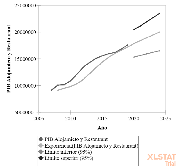El Producto Interno Bruto (PIB) para el sector Alojamiento y Restaurante demuestra un crecimiento exponencial abrupto dentro del sector turismo. Explicando un crecimiento a 18 mil 398 millones 307 mil dólares americanos para 2021, esto representa un incremento porcentual de 7% y sigue creciendo hasta 19 mil 459 millones 502 mil dólares americanos para el año 2023. Se estima el ingreso per cápita en 1137 dólares americanos a finales de 2020, como efecto de la recuperación post Covid-19. El pronóstico para finales de 2021 es de 1136 US$ y para 2023 será de 1133 US$. En lo que se refiere al ingreso de divisas, la estimación del modelo suavizado doble exponencial es de 5161 millones de US$ para el año 2021 y para el año 2023, se estima en 5508 millones de US$.