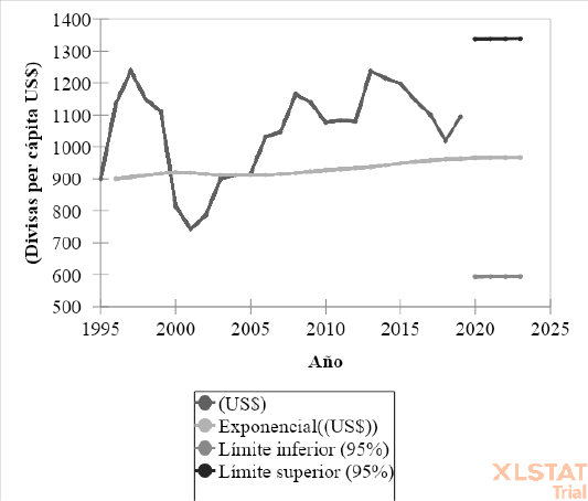 La línea de tendencia exponencial en el Gráfico a 5, explica la incertidumbre en torno a la evolución de la pandemia. Para el año 2021 el ingreso de divisas per cápita será de 965.877 US$ y para 2023 este variará hasta 966.503 US$. Es decir, solo se incrementará 0.626 dólares americanos.