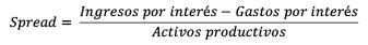 Por su parte, Barth et al, (2013) y Gelos (2009), establecen que los países menos desarrollados son los que poseen spreads de intermediación más altos, mismos que están relacionados con un alto indicador de ineficiencia, pues la relación de costo-ingreso es más alta. En torno a la eficiencia, Guillén, Rengifo & Ozsoz (2014) señalan que una mejor gestión de insumos y productos financieros por parte de los bancos conllevar a una mejor rentabilidad para los mismos, pues los riesgos operativos, de mercado, crédito, liquidez, etc. estarán controlados. Por otro lado, Dwumfour (2019) establece que mientras más competitiva la estructura del mercado, menor será el NIM, debiendo la política pública propender a la competencia de mercado. De esta manera, en la presente investigación el spread financiero será calculado de la siguiente forma: