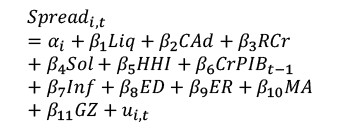 El riesgo de crédito muestra una relación negativa y estadísticamente significativa, similar a lo expuesto por Urbina-Poveda (2019), incrementos en los niveles de morosidad afectan directamente a la calidad de la cartera y, por tanto, a resultados esto es debido a las pérdidas generadas. De acuerdo a lo esperado, el indicador de solvencia se encuentra que está positivamente relacionado con el spread financiero; sin embargo, no resultó ser significativo en ninguna de las estimaciones realizadas.