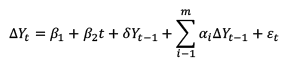 De esta manera, de acuerdo con Gujarati y Porter (2010), para realizar la prueba de cointegración primero se debe determinar que las variables cumplan con ciertas condiciones que permitan aplicar la prueba. Estas condiciones son: que sean no estacionarias y que sean del mismo orden de integración (de nivel uno). Para lo cual, de acuerdo con los autores, primero se debe hacer una prueba de raíz unitaria sobre cada una de las series de tiempo analizadas. Para ello, usando el software Eviews se efectuarán ocho pruebas Dickey-Fuller Aumentada (DFA) (cuatro con tendencia y cuatro sin tendencia), las cuales, tendrán la forma que se presenta en la ecuación (1):