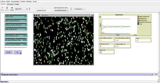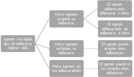 La simulación utiliza cuatro ‘tipos de agentes’: a) con influencia útil; b) con influencia no útil; c) influenciables; y, d) no influenciables. |