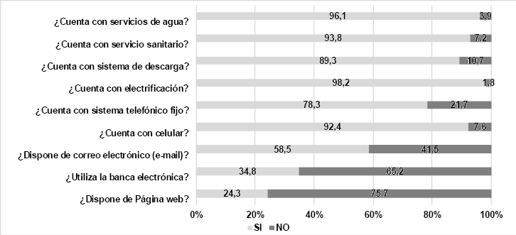 Para el factor de tecnología, se pudo verificar que las MiPymes poseen una infraestructura, en términos de servicios de agua, sanitarios, electricidad y telefonía. Sin embargo, desde el punto de vista de las herramientas devenidas de las Tics, el uso del correo electrónico, la utilización de la banca electrónica y la disposición de una página web, aún no han sido implementadas en todas las MiPymes colombianas, con un 58.5%, 34.8% y 24.3%, respectivamente. En este punto tienen mucho que ver los modelos de negocios y el miedo que muchos sectores de la población tienen hacia la virtualización.
