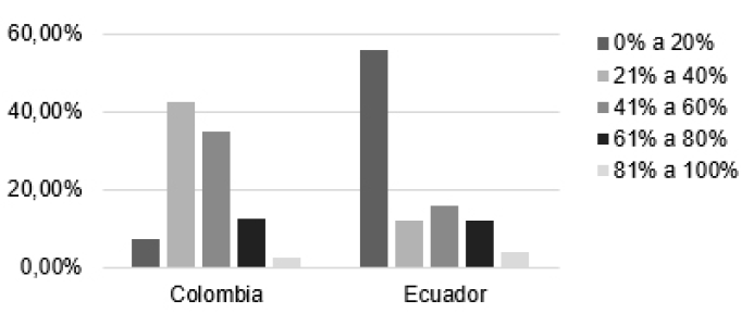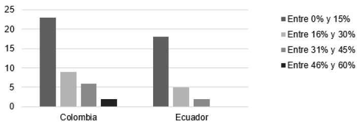 En el mismo plano financiero y al analizar el nivel de endeudamiento, se encontró que las empresas colombianas reciben más financiamiento externo que las ecuatorianas, llegando a encontrar empresas que financian sus actividades en un 50% aproximadamente (Grafico 5).