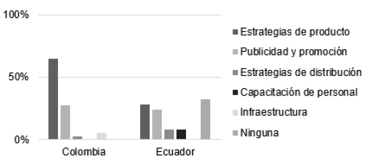 Otro aspecto donde se encontró diferencias en la caracterización del sector artesanal de los dos países fue el rubro en el que se hicieron mayores inversiones en el último año. Es así como en el caso de los emprendedores artesanales colombianos, el mayor porcentaje está enfocado en el mejoramiento del diseño y producción de su oferta, la publicidad y las estrategias de distribución e infraestructura. Sin embargo, se reconoce que no se hicieron inversiones en referencia a la capacitación del personal. Por otro lado, en el caso de los artesanos ecuatorianos, no realizaron ninguna inversión en el último año, al igual que en estrategias de producto y mucho menos en publicidad.