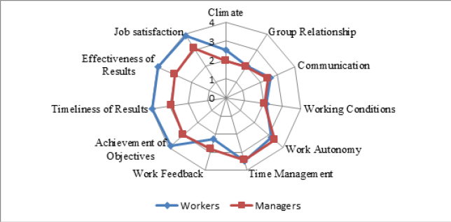 Similarly, a hypothesis test analysis was carried out to evaluate the relationship between the working conditions and the satisfaction level experienced, as well as the relationship between the working conditions and the time that workers and managers took in exercising this practice, assuming that an increase in working time should contribute to the improvement of working conditions. According to the results, there is no statistically significant relationship between working conditions and perceived satisfaction; on the other hand, there is a statistically significant relationship between the time teleworking is performed and the working conditions created.