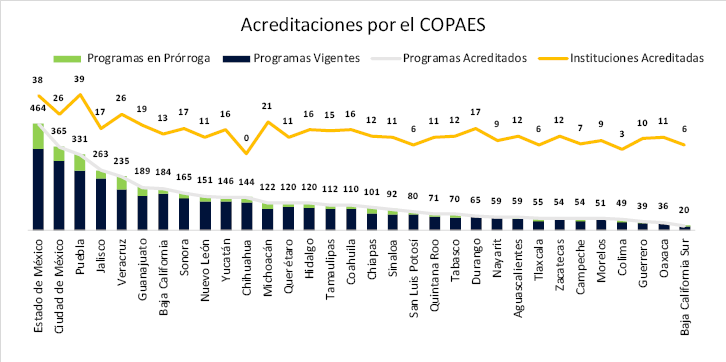 En la actualidad, México cuenta con 4176 programas están acreditados por el COPAES, 30 organismos acreditadoras y 411 instituciones acreditadoras, lo que representa un gran logro a nivel país si se comparan las cifras de hace 20 años. En el gráfico 1, muestra los resultados a octubre 2022 distribuidos por los Estados de México, en este sentido, Ciudad de México, Sonora, Jalisco y Veracruz son los que poseen mayor número de programas vigentes, de instituciones acreditadas y representatividad de los organismos acreditadores.