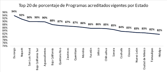 En este contexto, al analizar únicamente el porcentaje de programas vigentes del total de programas acreditados, los Estados de Durango, Nayarit, San Luis Potosí, Baja California y Aguascalientes, son los que se mantienen por encima del 90% de sus programas dentro de esta categoría. En general, el 63% de los Estados tienen al menos el 80% de sus programas vigentes, y el restante 37% al menos en 70%. El gráfico 2 muestra el porcentaje de programas vigentes entre el total de programas acreditados.