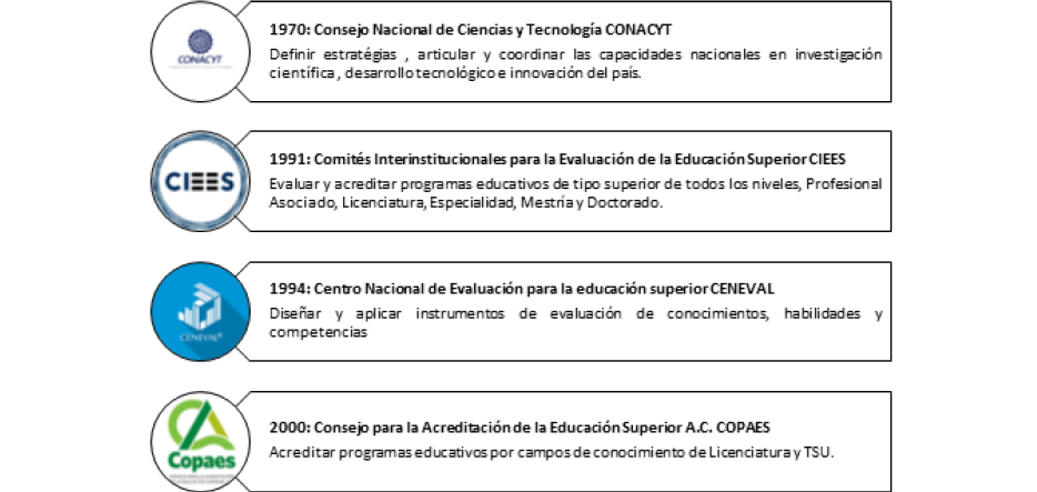 Por otra parte, se encuentran los organismos especializados en garantizar y acreditar la calidad de las instituciones educativas y los programas académicos sobre educación superior, tal es el caso de los Comités Interinstitucionales para la Evaluación de la Educación Superior (CIEES), el Consejo para la Acreditación de la Educación Superior (COPAES), la Federación de Instituciones Mexicanas Particulares de Educación Superior (FIMPES) y el Consejo Nacional de Ciencia y Tecnología (CONACyT) (Asociación Colombiana de Universidades [ASCUN], 2022).