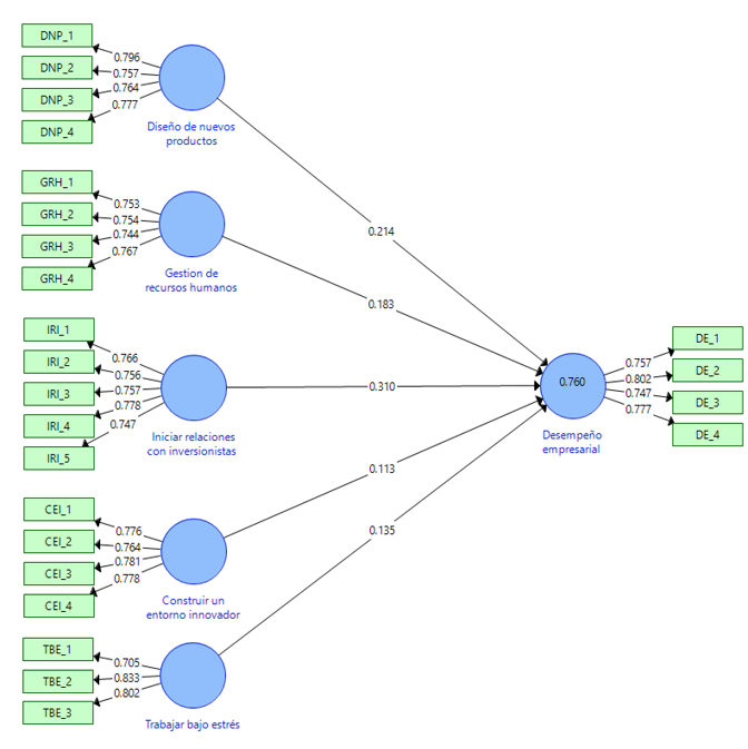 Una vez que se alcanzó el modelo de medición, se verificó mediante bootstrapping en un rango de submuestras de 300, según lo propuesto por Hair et al, (2021) tal y como se muestra en la tabla 5, en ella se aprecia que las 5 dimensiones que forman parte de la AEE demuestran que afecta positivamente sobre el DE. El diseño de nuevos productos afecta positivamente al desempeño empresarial (β=0.21, t=4.18, p<0.01); del mismo modo, gestionar los recursos humanos afecta positivamente al desempeño empresarial (β=0.18, t=2.95, p<0.01); el iniciar relaciones con inversionistas afecta positivamente al desempeño empresarial (β=0.31, t=5.78, p<0.01); De manera similar, construir un entorno innovador afecta positivamente al desempeño empresarial (β=0.11, t=1.69, p<0.05) y la dimensión de trabajar bajo estrés afecta positivamente al desempeño empresarial (β=0.14, t=3.01, p<0.01).