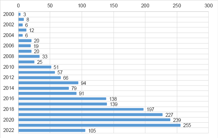 La búsqueda realizada en Web of Science Core Collection en el periodo de 2000 a 2022, tras afinar la búsqueda siguiendo los criterios de inclusión, dio como resultado un total de 1996 registros ver gráfico 1.