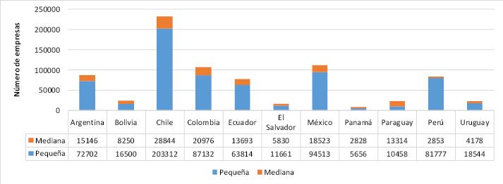 En todos los casos observados, es mayoritaria la presencia de las pequeñas empresas, sobre las medianas que tienen una participación marginal. Ecuador es un país pequeño; sin embargo, tiene una contribución importante de pequeñas y medianas empresas si lo comparamos con países como México, Colombia, Perú.